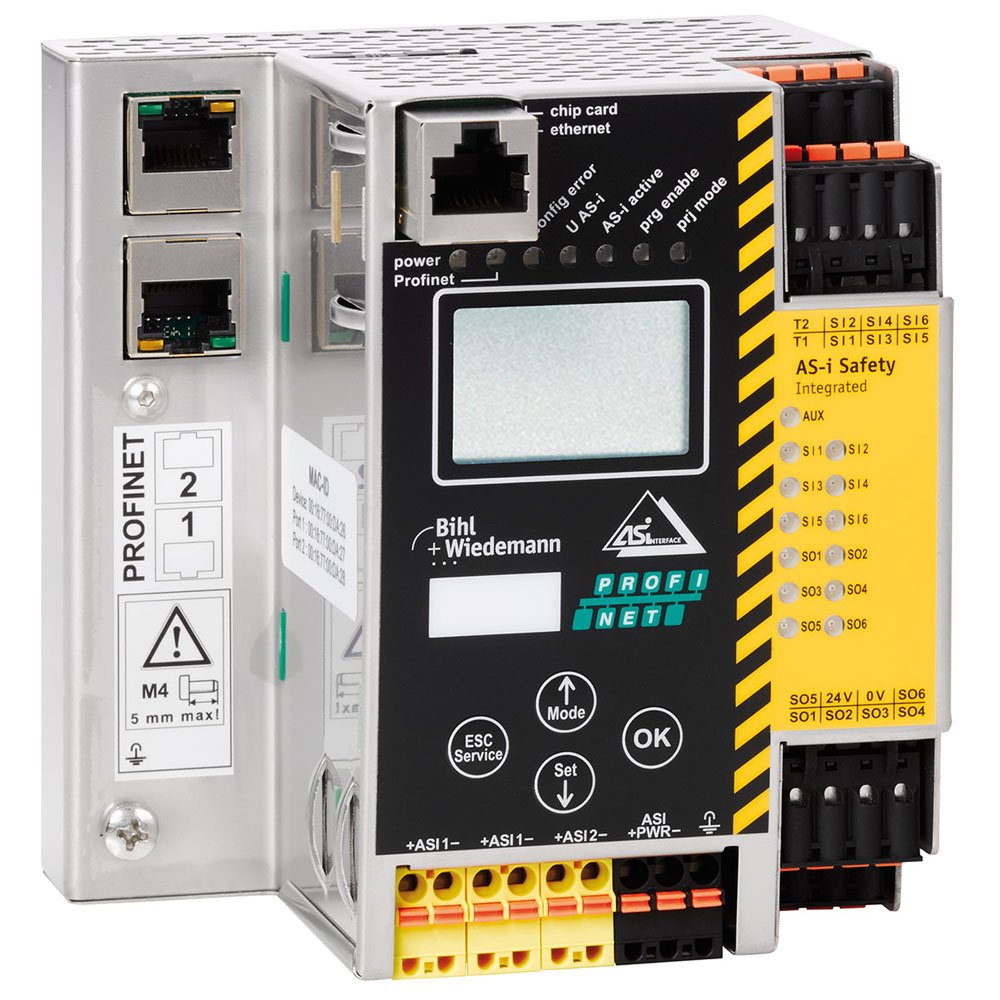 ASi-3 PROFIsafe via PROFINET Gateway with integrated Safety Monitor, 2 ASi-3 masters, integrated decoupling, max. 4 A per ASi circuit, ASi current measurement in the gateway, 6 digital inputs or 3 x 2 channels safe inputs (SIL 3, cat. 4), expandable to max. 62 x 2 channels safe inputs, 1922 x 2 channels safe inputs in max. configuration, 6 release circuits (6 x electronic safe outputs), expandable to max. 64 safe outputs, 1984 safe outputs in max. configuration, PROFIsafe (F-CPU and Safe Link, diagnostic and configuration via PROFINET or Ethernet diagnostic interface, duplicate address recognition, ASi fault detector, programming in C optional, IP20