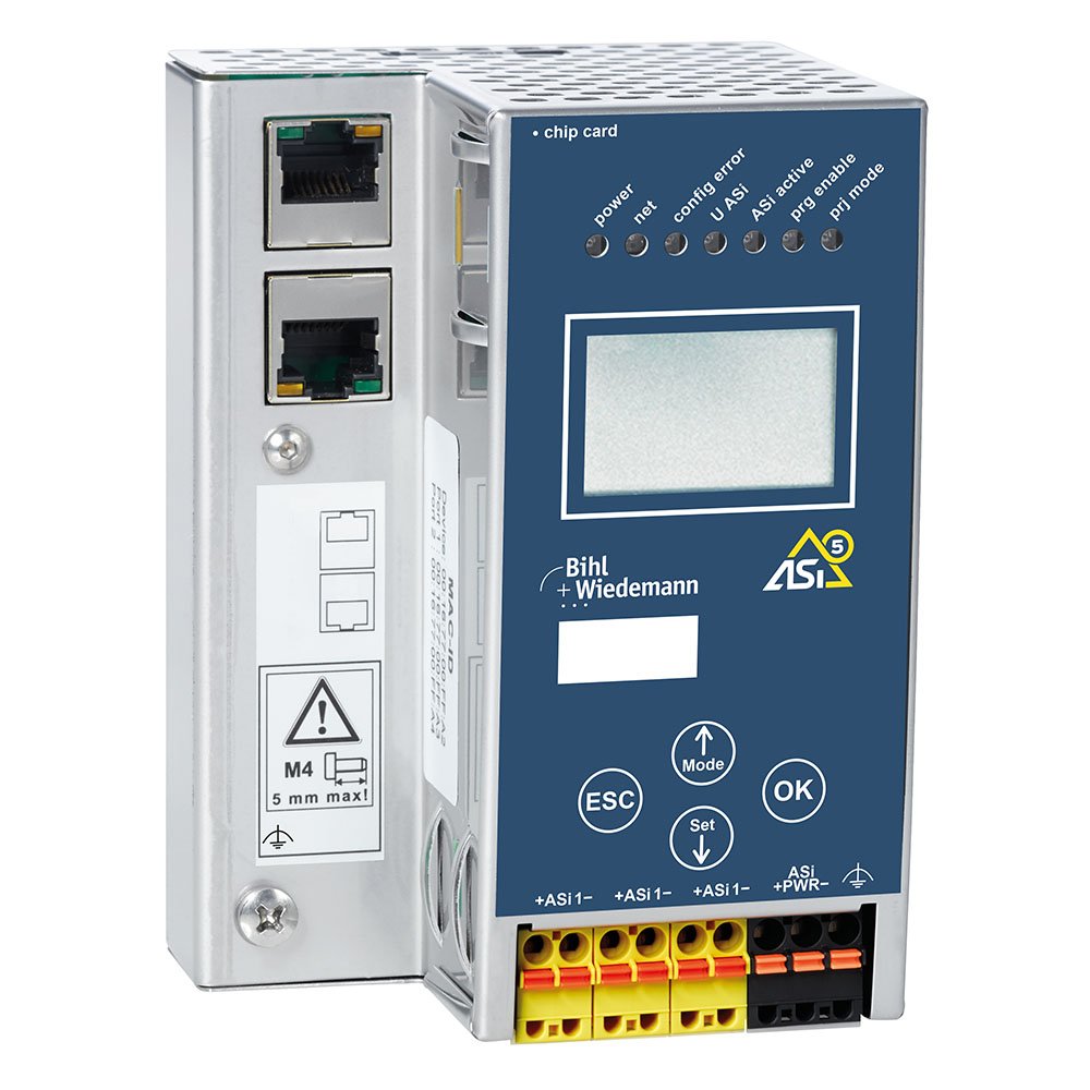 ASi-5/ASi-3 Function and EMC Test Master in Stainless Steel, 1 ASi-5/ASi-3 master, integrated decoupling, max. 4 A per ASi circuit, ASi current measurement in the gateway, diagnostic and configuration via Ethernet interface, IP20