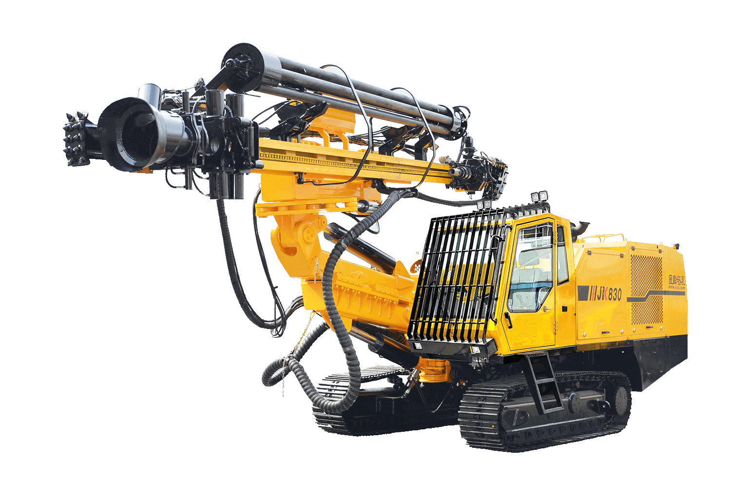 The JK830‑2 drilling rig is a powerful self-propelled hydraulic unit for drilling holes with a diameter of 138–235 mm. It is equipped with a high-pressure compressor, an automatic pipe feed system and an operator's cabin with FOPS protection. It is designed for work in quarries and severe climatic conditions, including temperatures down to -45°C.